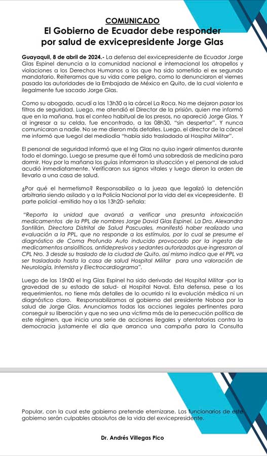 El abogado lamentó la falta de información oficial sobre el estado de salud de Glas, así como la negativa de las autoridades del hospital a proporcionar detalles sobre su condición.