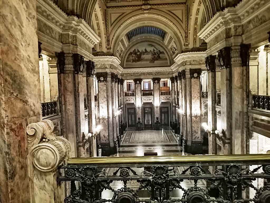 El gran Salón de los Pasos Perdidos, inspirado en las grandes catedrales del renacimiento, está compuesto de dos bóvedas de cañón corrido y majestuoso lucernario central, que separa los dos hemiciclos en los que sesionan el Senado y la Cámara de Representantes.