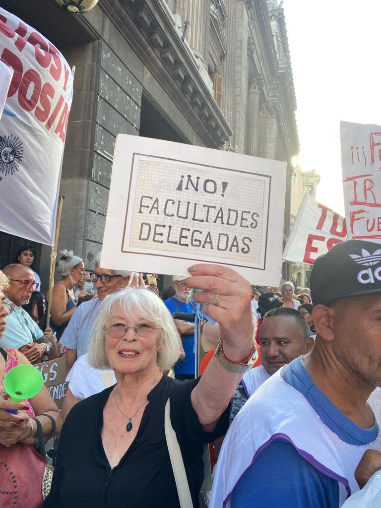 Con carteles como La Patria no se vende, ¡No a las facultades delegadas! y Aumento de la jubilación, miembros de la Central de Trabajadores de Argentina (CTA), la CTA Autónoma y otras agrupaciones expresaron su desacuerdo con un decreto de necesidad y urgencia y un paquete de leyes presentados por el presidente Javier Milei.
