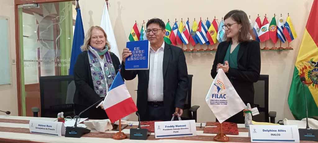 Rubricaron este documento el presidente del Filac y la vicetitular del Inalco, Delphine Alles, en presencia de la embajadora de Francia en Bolivia, Helene Roos.