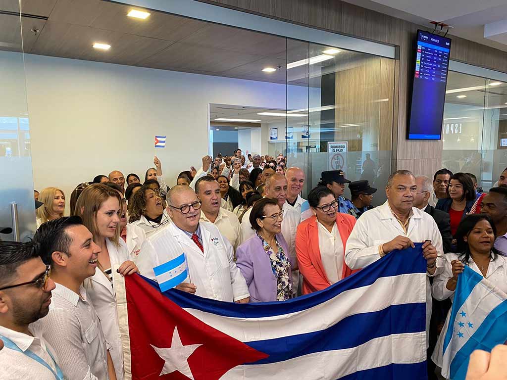 Asimismo, integrantes de la Asociación de Amistad Honduras-Cuba provenientes de varios departamentos y presidida por Erasto Reyes, se dieron cita en el aeródromo hondureño para recibir al contingente de médicos cubanos que trabajará en varios departamentos del país.