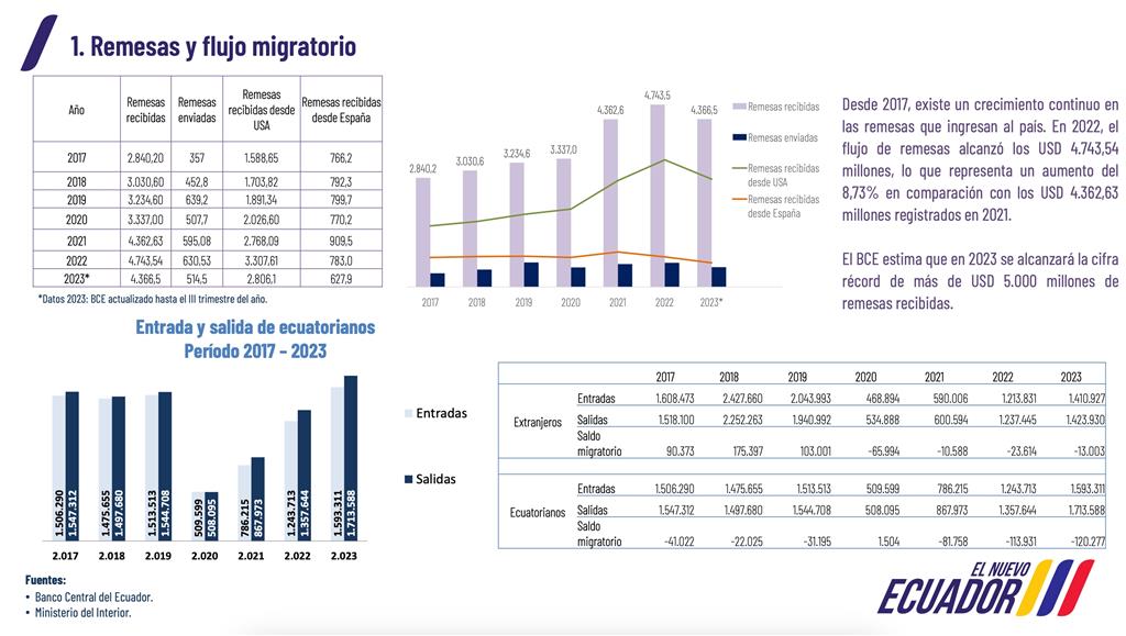 En sintonía con esa ola migratoria hubo un alza de las remesas, que llegaron en 2023 a cuatro mil 366 millones de dólares.