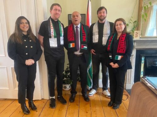 En la ocasión, el presidente del club, Matt Devaney, agradeció a la embajadora Jilan Wahba Abdalmajid por sus esfuerzos para hacer posible el encuentro con los funcionarios de la Asociación Palestina en Dalymount Park.