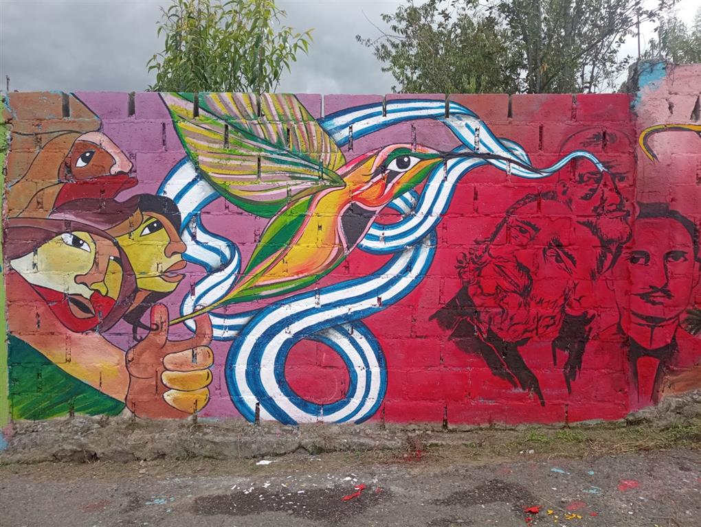 El mural abarca toda una pared y en él se aprecia un tocororo, ave nacional de Cuba, y un colibrí de estas tierras andinas que llevan en sus picos las banderas de los dos países en símbolo de hermandad.