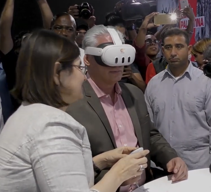 Con una vista en 360 grados el que usa las gafas podrá caminar por los escombros y la destrucción de las calles de Gaza, incluye además materiales audiovisuales, fotografías y cifras numéricas de cuánto ha costado en materia humana e infraestructura económica la agresión sionista.