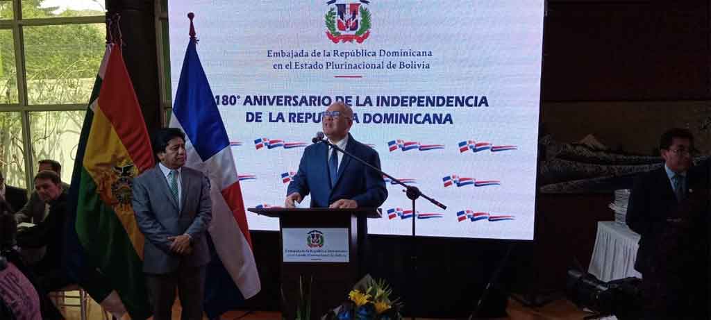 Al acto asistieron jefes de 32 misiones diplomáticas acreditadas en el Estado Plurinacional, agregados militares, autoridades gubernamentales y elegidas nacionales, departamentales y municipales, líderes de movimientos sociales y una representación de la comunidad de dominicanos residentes en Bolivia.
