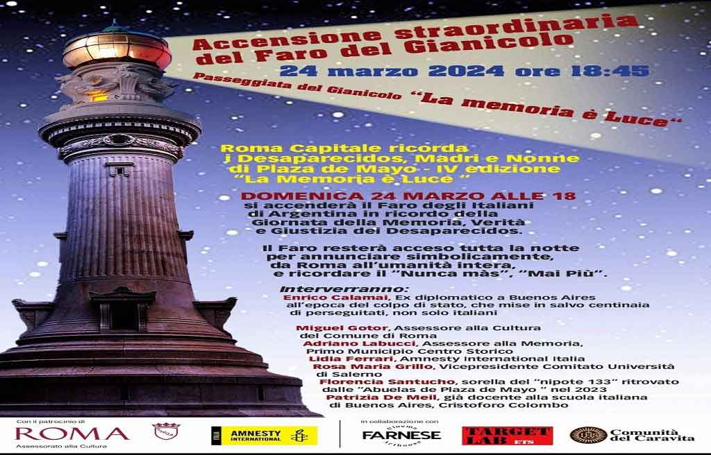 El alcalde de Roma, Roberto Gualtieri, señaló en relación con estos actos que, durante los mismos, “la luz tricolor del Faro del Gianícolo ilumina la ciudad en recuerdo de un período dramático de la historia argentina”, y recientemente culminó una restauración de ese equipo, así como del monumento, que recuperaron su magnificencia original.