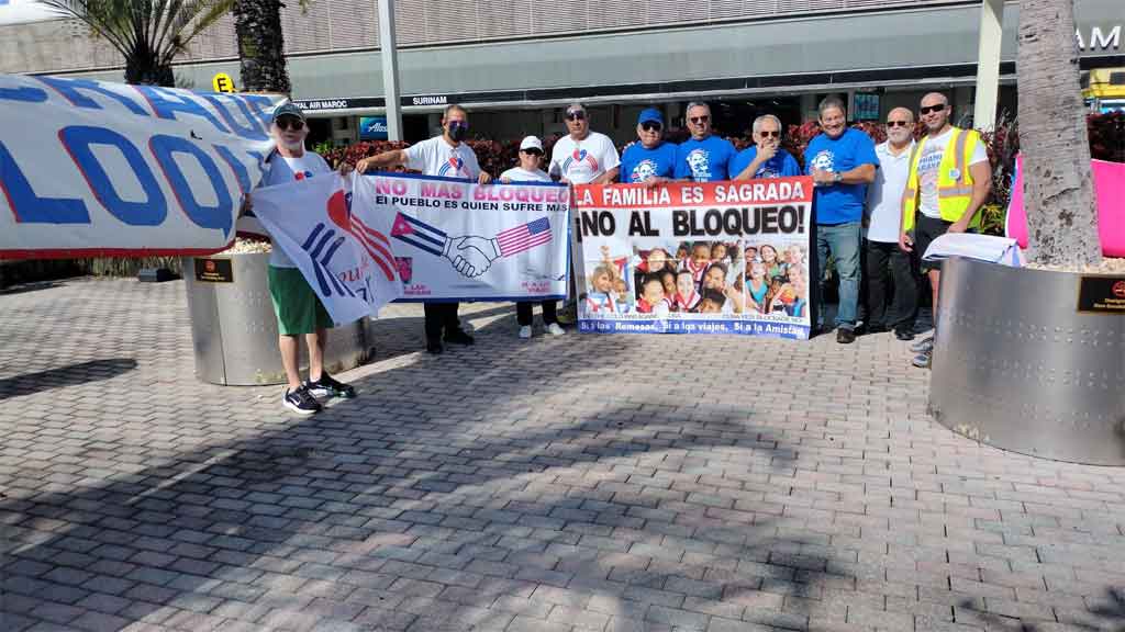Congregados en el Parque de las Banderas del Aeropuerto Internacional de Miami, representantes de la Asociación Cultural José Martí, de Puentes de Amor, entre otros grupos, expresaron su rechazo a la continuidad de esa hostil política hacia Cuba que ya dura más de 60 años.