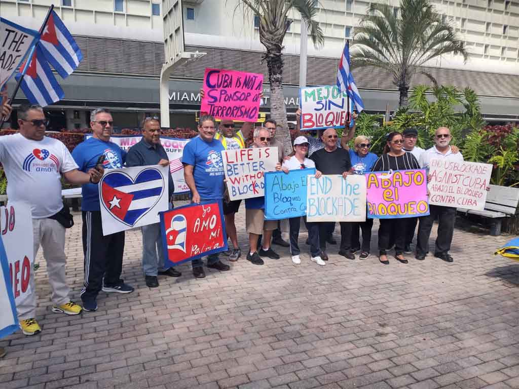 Congregados en el Parque de las Banderas del Aeropuerto Internacional de Miami, representantes de la Asociación Cultural José Martí, de Puentes de Amor, entre otros grupos, expresaron su rechazo a la continuidad de esa hostil política hacia Cuba que ya dura más de 60 años.