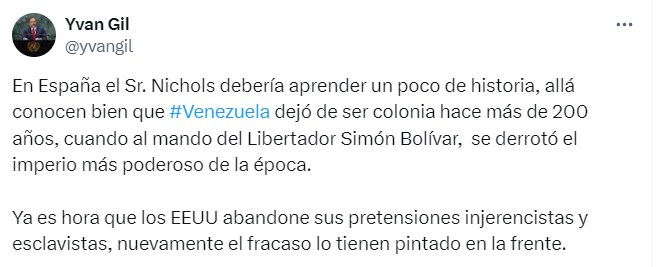 El alto diplomático manifestó que Nichols “debería aprender un poco de historia” y afirmó que “allá conocen bien que Venezuela dejó de ser colonia hace más de 200 años, cuando al mando del Libertador Simón Bolívar, se derrotó el imperio más poderoso de la época».