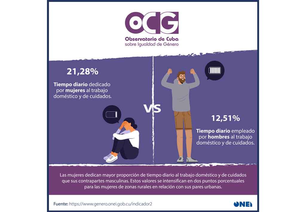 Según datos publicados por la ONEI en su cuenta oficial de Facebook las mujeres dedican más del 21 por ciento de su tiempo al trabajo no remunerado, prácticamente el doble que sus contrapartes masculinas que emplean solo un 12 por ciento.