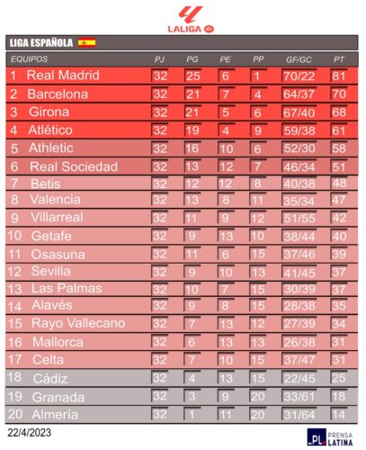 La Liga es dominada por el Real Madrid (81), seguida del Barcelona (70), el Girona (68) y el Atlético de Madrid (61), que cierra puestos de Liga de Campeones para la próxima temporada cuando apenas restan seis fechas por disputar.