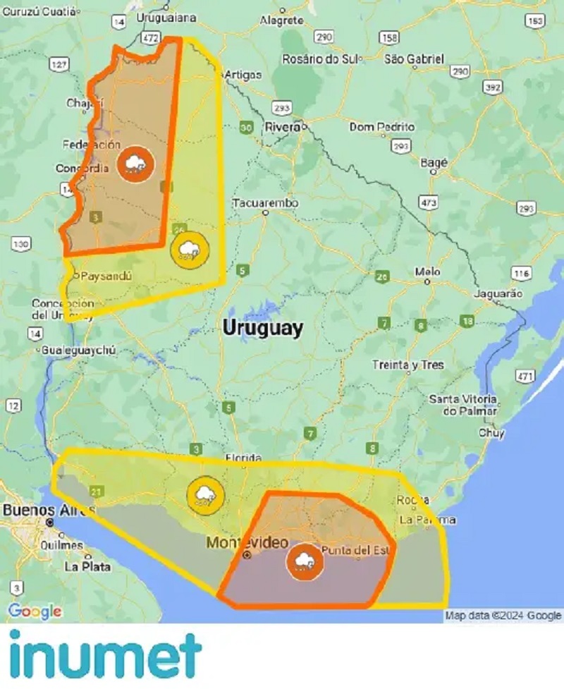 Inumet emitió una alerta naranja y otra amarilla para el sur del país, donde se asienta la capital uruguaya y viven cerca de dos millones de personas. Luego agregó advertencias para otras zonas del país.