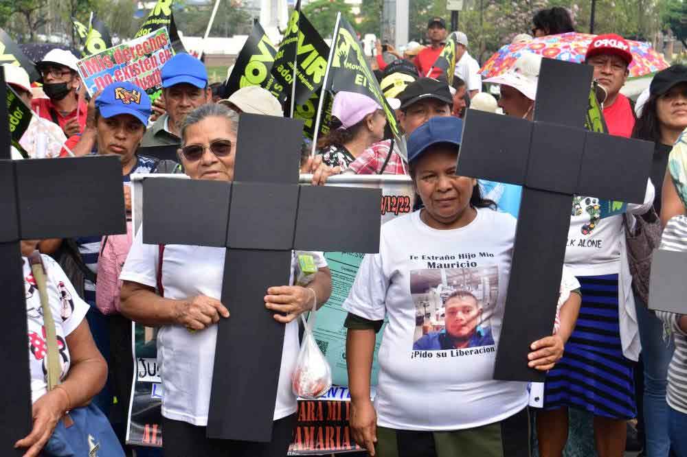 En la protesta no faltaron las cruces negras de madres de víctimas del régimen de excepción que unidas en el Movimiento de Víctimas del Régimen (Vamos) exigían saber la suerte de familiares detenidos sin justificación, ni las demandas de los veteranos y lisiados de guerra a los que se niegan derechos y prestaciones.