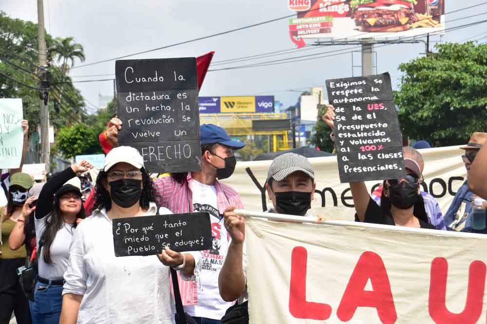 Los estudiantes exigieron el pago del presupuesto a la UES, mientras mostraban carteles que preguntaban por qué tanto temor a que el pueblo se eduque, mientras otros mostraban su inconformidad con la situación actual, “cuando la dictadura es un hecho, la revolución es un derecho”, además de reflejar inconformidad por el uso de la sede como albergue gubernamental.