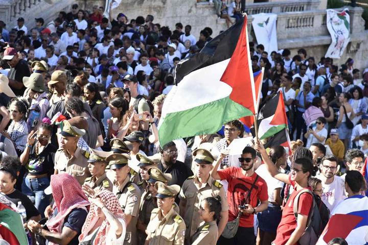 Junto a colegiales cubanos de varias enseñanzas, acudieron alumnos de Palestina y Estados Unidos e integrantes de la brigada internacional de solidaridad con Cuba Primero de Mayo, quienes rechazaron la represión policial contra sus homólogos norteamericanos por denunciar los crímenes en Palestina.
