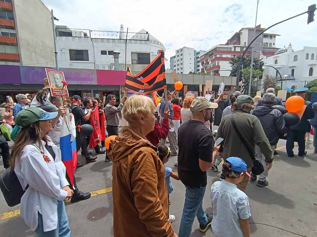 Con fotografías de familiares que lucharon en la Segunda Guerra Mundial, flores y la simbólica cinta de San Jorge, decenas de personas caminaron este sábado por las afueras de la embajada de Moscú en Quito en la tradicional marcha del Regimiento Inmortal.