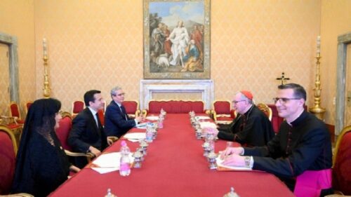 Al culminar su encuentro con el Papa, Noboa y los miembros de su delegación, integrada además por la subsecretaria del despacho presidencial, Cynthia Gellibert; la de Protocolo, Gicela Andrade, y por el director de Logística, Juan Bleggi, se reunieron con el secretario para las Relaciones con los Estados, Paul Richard Gallagher,