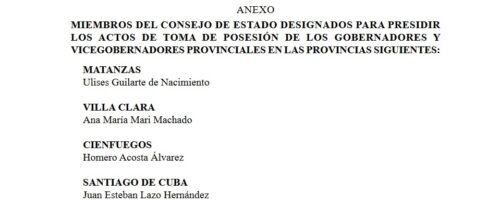 Agrega la información que los miembros del CE designados para presidir los actos en cada uno de estos territorios son: Esteban Lazo (Santiago de Cuba), Ana María Mari Machado (Villa Clara), Homero Acosta (Cienfuegos) y Ulises Guilarte de Nacimiento (Matanzas), por el acuerdo no. 176-X, publicado hoy en la Gaceta Oficial de la República N. 34 (extraordinaria).