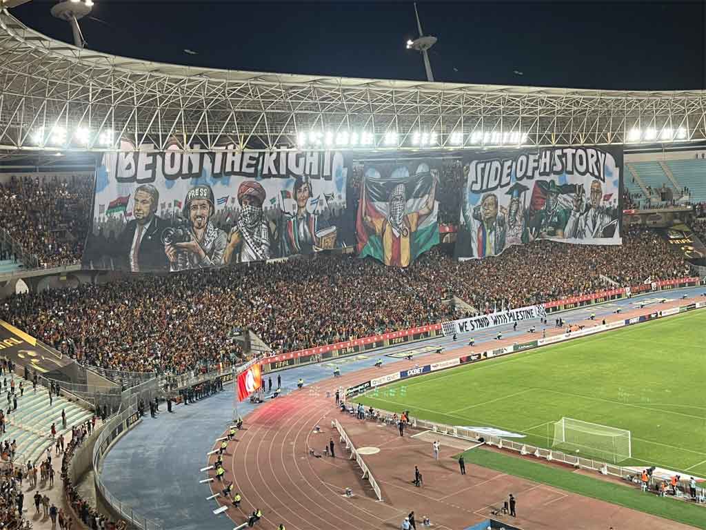 Gigantes mosaicos fueron desplegados por todas las gradas con mensajes de respaldo al pueblo palestino y un llamado a exigir el fin del genocidio sionista en la Franja.