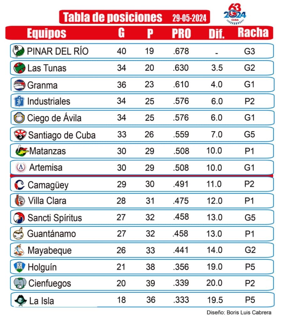 A Pinar del Río (40-19) y Las Tunas (34-20) los siguen Granma (36-23), Industriales y Ciego de Ávila (34-25), Santiago de Cuba (33-26) y Matanzas y Artemisa (30-29).