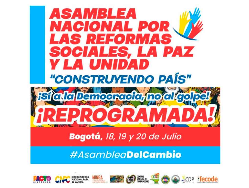 La Asamblea Nacional por las reformas sociales, la paz y la unidad es convocada por el Comando Nacional Unitario, la Coordinadora Nacional por el Cambio, el Pacto Histórico y la Minga Social y Comunitaria, así como por otras organizaciones sociales.