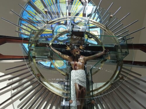 Su estructura principal representa dos manos en oración que se elevan desde los laterales para unirse frente a la cruz en lo alto del templo. Mientras, el campanario, situado a un lado del edificio, evoca los brazos abiertos y simboliza la súplica a Dios.
