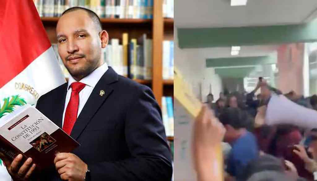 El congresista llegó a la Facultad rodeado de un grupo de seguidores y guardas de seguridad y en la puerta lo esperaron, con pancartas, alumnos que coreaban lemas como “Escucha, Muñante, San Marcos te repudia” y “San Marcos es del Pueblo y no de los corruptos”.