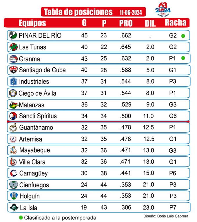 La tabla de posiciones mantiene a Pinar del Río de líder (45-23), seguido por Las Tunas (40-22), Granma (43-25), Santiago de Cuba (40-28), Ciego de Ávila e Industriales (37-31), Matanzas (36-32) y Sancti Spíritus (34-34).
