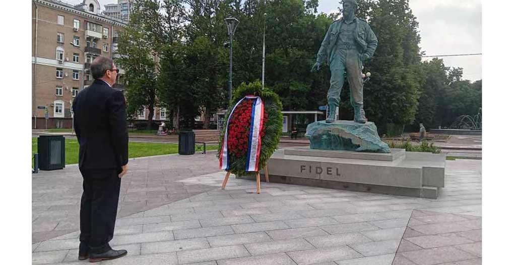 “Al líder histórico de la Revolución cubana del pueblo y Gobierno de Cuba”, se lee en las bandas del arreglo floral depositado por el ministro de Relaciones Exteriores en la escultura erigida en su honor en el distrito de Sokol, de Moscú.