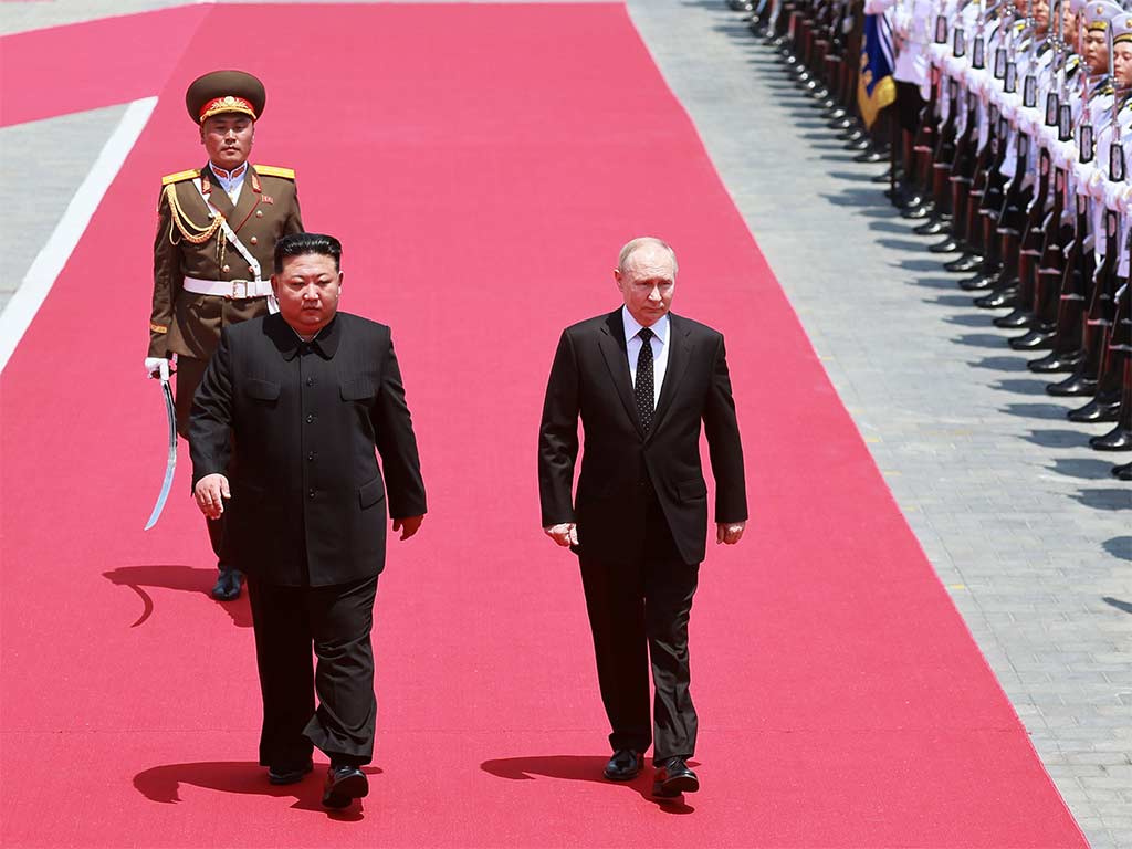 Durante la mañana de Pyongyang, Putin participó en la ceremonia solemne en la plaza Kim Il Sung, junto a Kim.