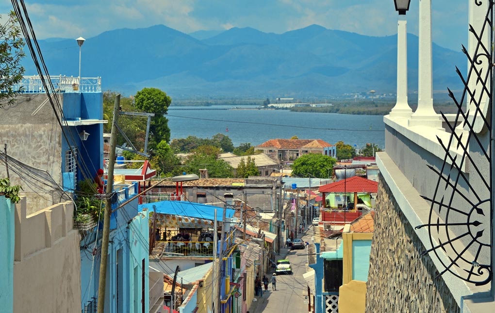 El centro histórico de la ciudad de Santiago de Cuba puede ser observado casi en su totalidad desde la bahía, como si se mirara desde el escenario de un anfiteatro, porque muchas de sus calles están ubicada en forma de terrazas a lo largo de la ladera de una montaña surcada desde la cima hacia el mar.
