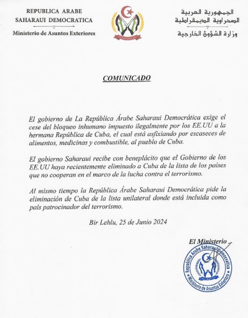 En la red social X, el máximo jefe de la diplomacia cubana resaltó la declaración emitida por el gobierno de la RASD que expresa su rechazo al cerco económico, comercial y financiero y exige la retirada de la nación caribeña de la lista de Estados que supuestamente patrocinan el terrorismo.