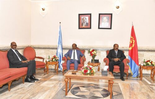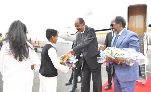 Afwerki dio una cálida bienvenida a Mohamud en el Aeropuerto Internacional de Asmara, reveló el ministro de Información eritreo, Yemane G. Meskel.
