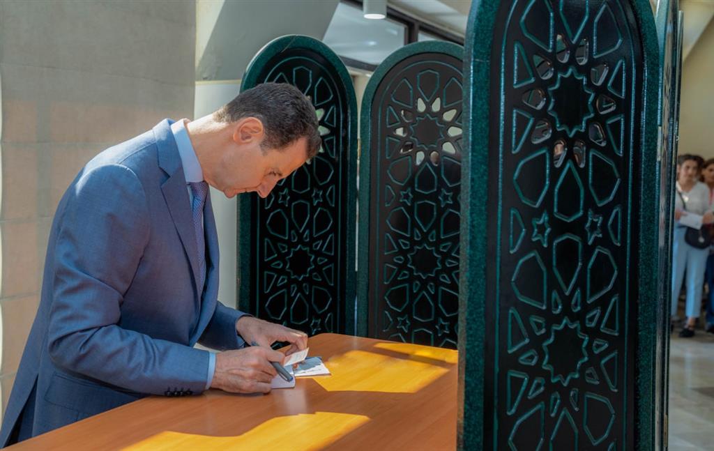 Imágenes difundidas por la presidencia de la república mostraron al mandatario ejerciendo su derecho al voto en un colegio electoral establecidos en la sede de la Empresa Siria de Telecomunicaciones en el barrio capitalino de Mezzeh.