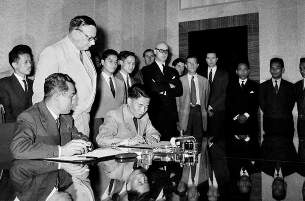 La firma de este pacto el 21 de julio de 1954, tras 75 días de intensas y complicadas negociaciones, fue precipitada por la histórica victoria conseguida por el pueblo vietnamita en la batalla de Dien Bien Phu, el 7 de mayo de ese mismo año.