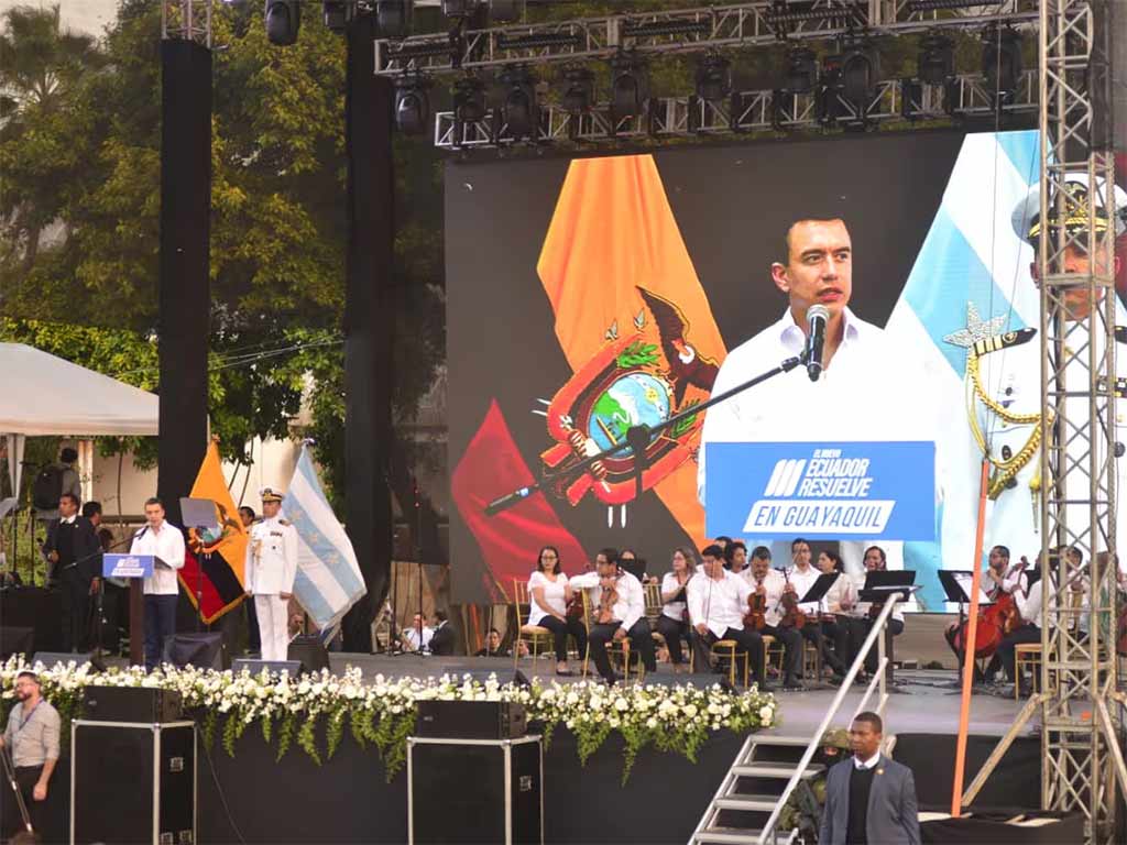 En medio de disputas entre ambas autoridades, el mandatario ecuatoriano presidió una sesión solemne en la explanada del Teatro Centro Cívico de la urbe más poblada del país y una de las más violentas.