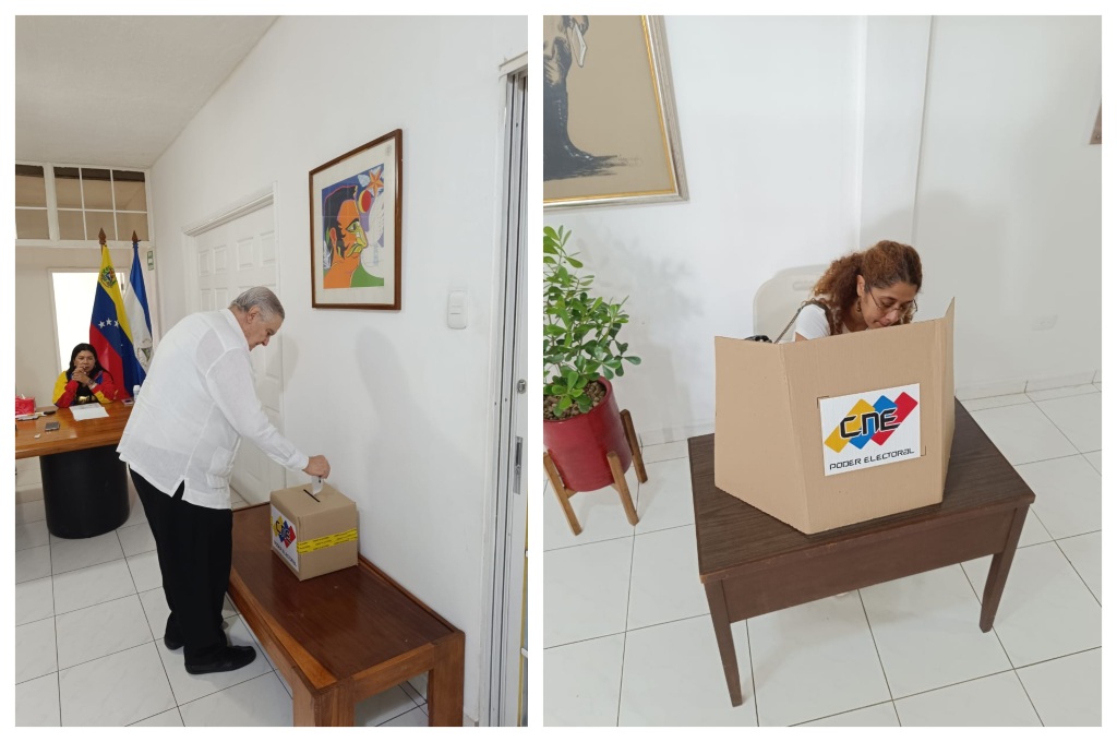 El primero en ejercer su derecho al sufragio fue el presidente de la mesa y Embajador de Caracas en Managua, Javier Arrue, quien tras depositar su boleta en la urna afirmó que es un privilegio participar en una fiesta transparente y en paz.