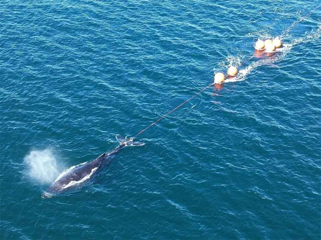 En total, el animal estuvo enredado durante 22 horas y requirió el apoyo de varios socorristas para poder deshacerse de las cuerdas que le impedían regresar a mar abierto.