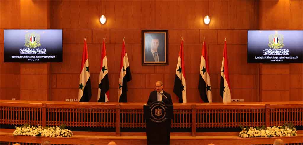 Pese a las presiones ejercidas por las potencias occidentales con objetivos disuasivos, Damasco ha tomado decisiones nacionales y adoptado posiciones de principios de forma soberana e independiente, dijo el Canciller en su intervención durante la reunión ordinaria de embajadores y jefes de misiones diplomáticas sirias en el exterior.