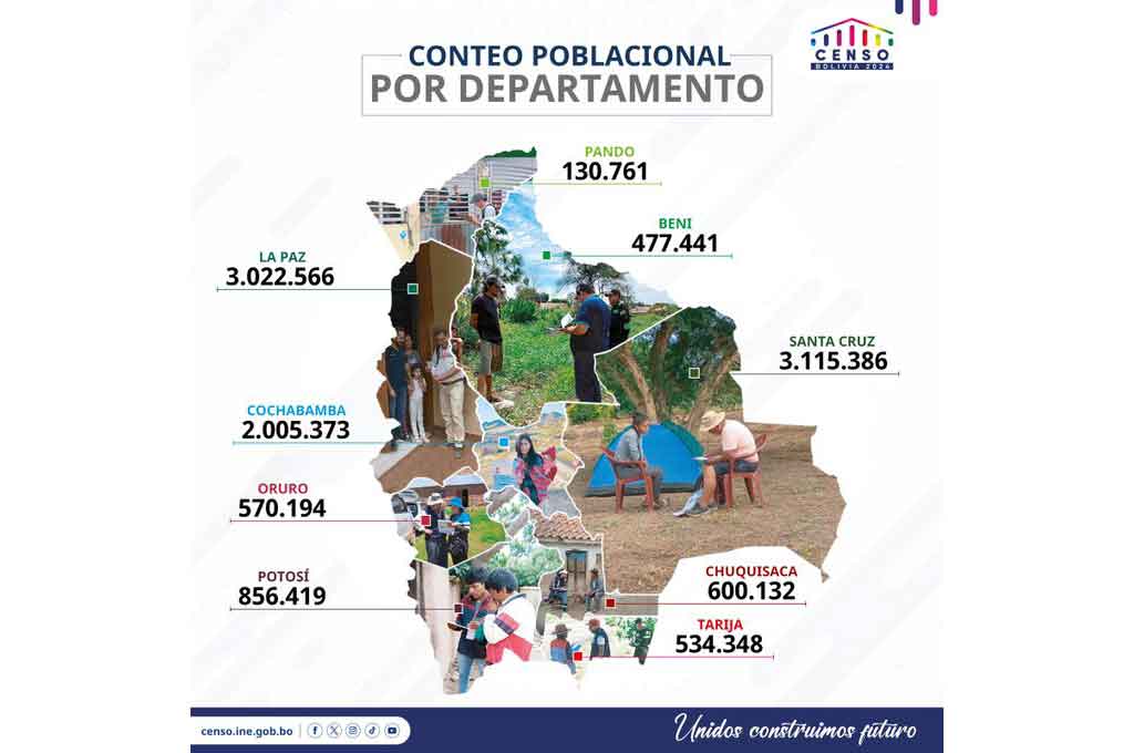 Describió que la distribución de la población por departamento es la siguiente: Santa Cruz (tres millones 115 mil 386 habitantes), La Paz (tres millones 022 mil), Cochabamba (dos millones cinco mil), Potosí (856 mil), Chuquisaca (600 mil), Oruro (570 mil), Tarija (534 mil), Beni (477 mil) y Pando (130 mil).