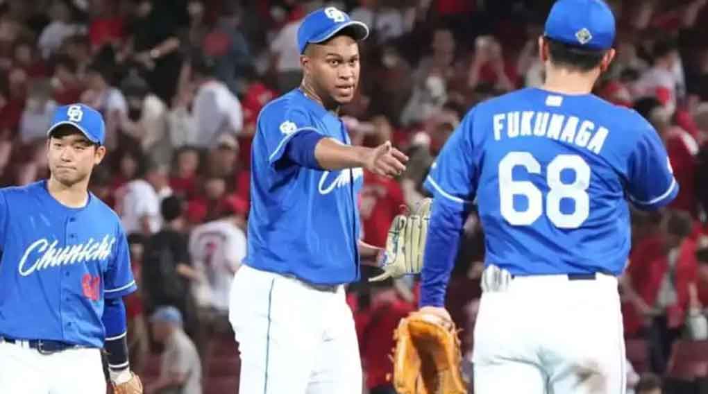 Tres bateadores retirados en fila, dos de ellos por la vía del ponche, fue la actuación del serpentinero antillano en el montículo del estadio Mazda ante más de 31 mil espectadores rivales, para igualar en el liderato de la Liga Central con el japonés Ryoji Kuribayashi.