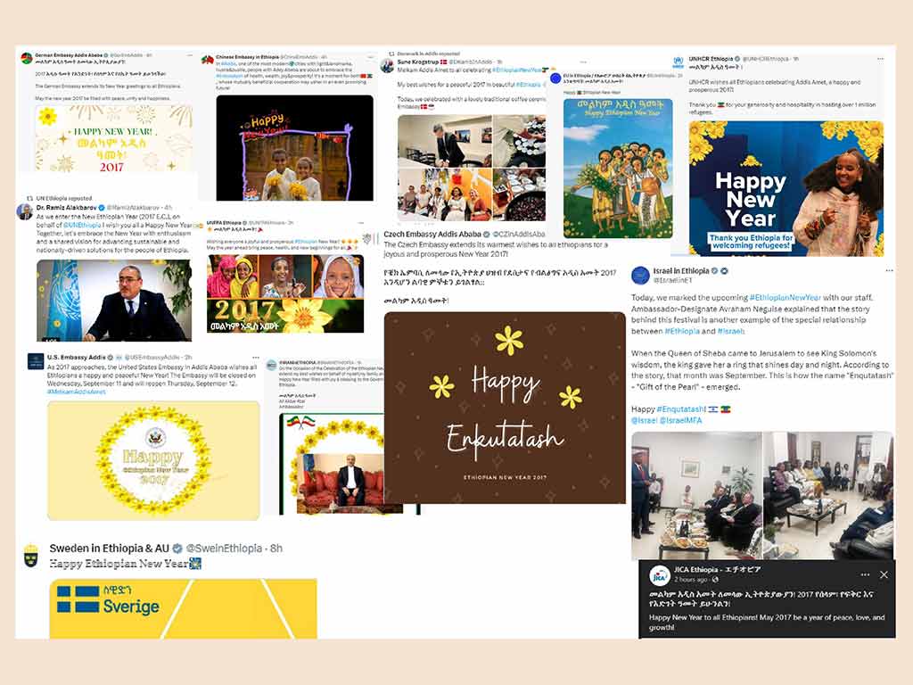 La embajada de China publicó que Addis Abeba, una de las ciudades más modernas, con luz y monumentos, ajetreo y bullicio acoge el Enkutatash (año nuevo) de salud, riqueza, alegría y prosperidad.