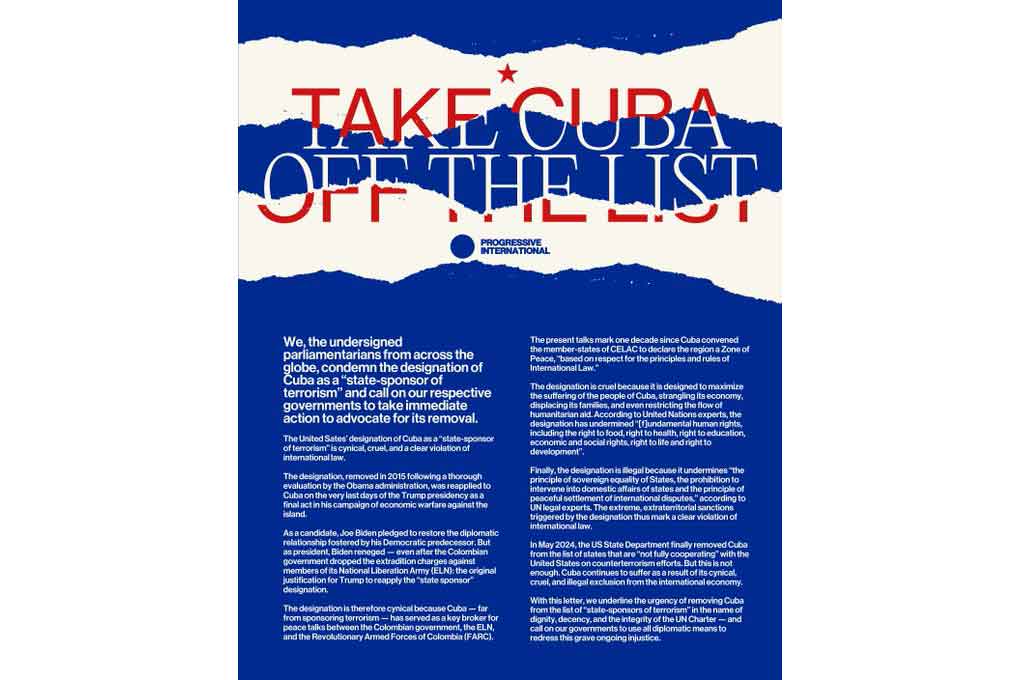 Mediante una carta publicada este viernes, los legisladores calificaron de cínica, cruel y una clara violación del derecho internacional dicha designación de la nación caribeña por parte de Estados Unidos.