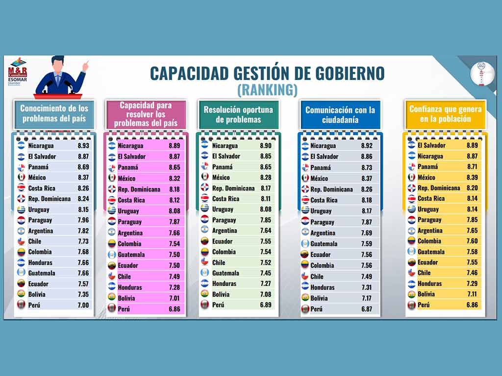 El sondeo arrojó que los países más rezagados en cuanto a capacidad de gestión de Gobierno son Perú con 6,90; Bolivia 7,14 y Honduras con 7,36.