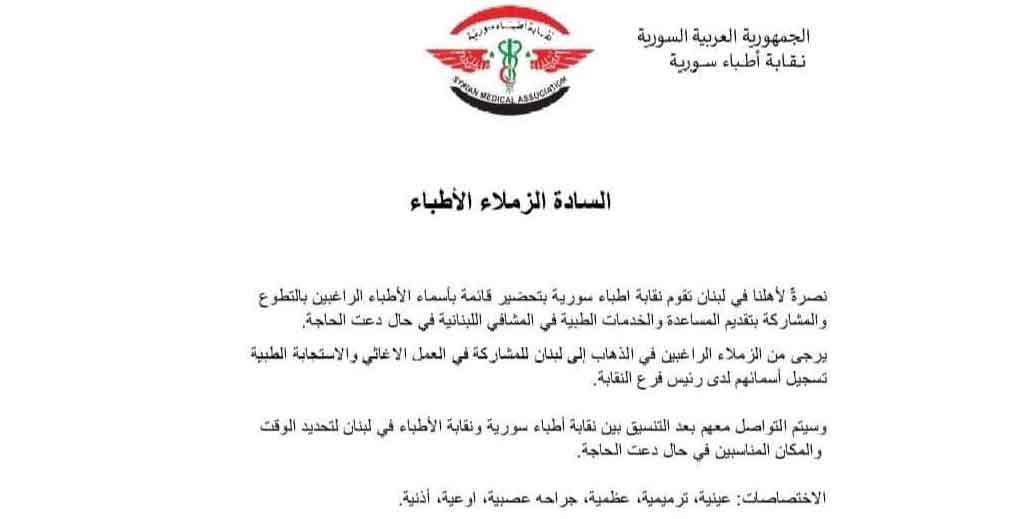 Por otro lado, el Sindicado emitió una circular en la que convocó a los doctores especialistas en oftalmología, cirugía reconstructiva, ortopedia, neurocirugía y cirugía vascular y auricular, a inscribirse como voluntarios para dirigirse a la nación de los cedros.