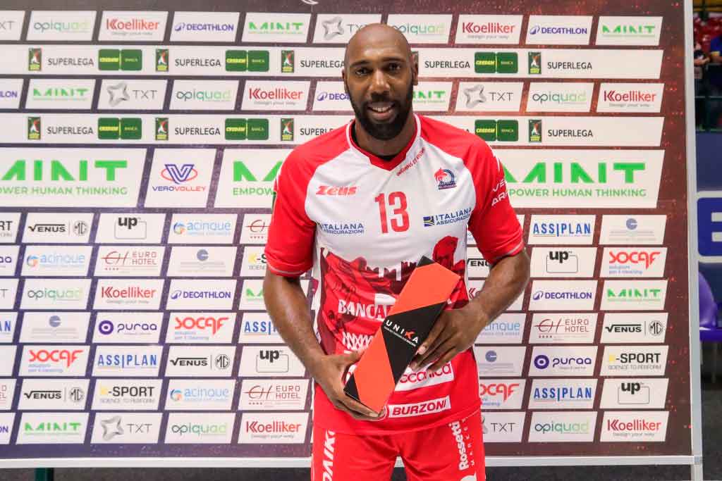 El veterano central cubano (2.08 metros y 37 años) aportó 12 puntos (ocho ataques y cuatro bloqueos), similar cifra a la del atacador auxiliar canadiense Stephen Maar, secundados ambos por el opuesto italiano Yuri Romanó con nueve.