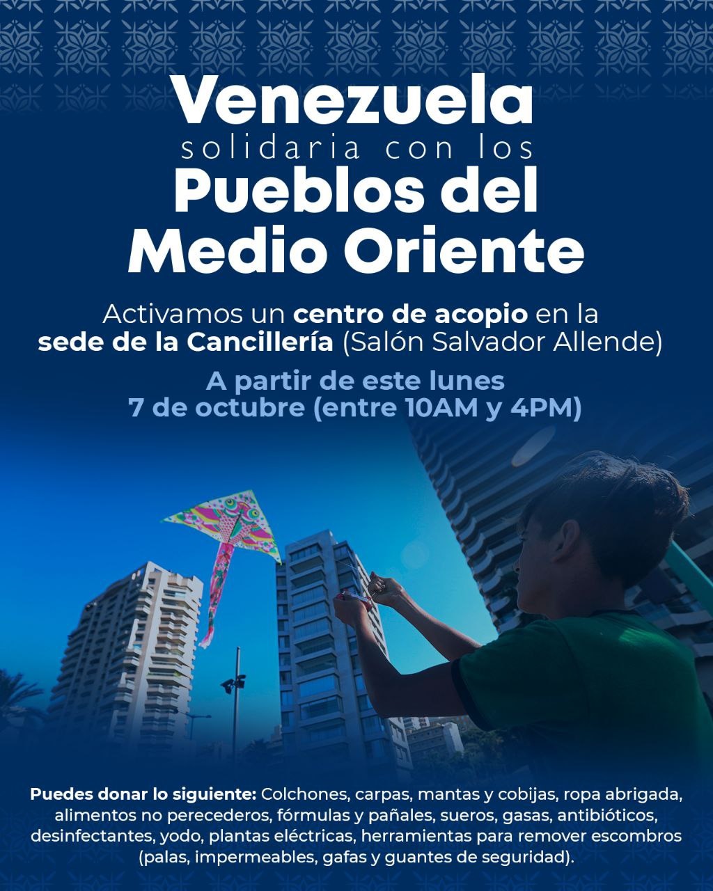 Caracas, 7 oct (Prensa Latina) El Gobierno de Venezuela consideró crucial la solidaridad en estos tiempos de fascismo imperialista con los pueblos hermanos del Medio Oriente y activó hoy un centro de acopio para recibir donativos.