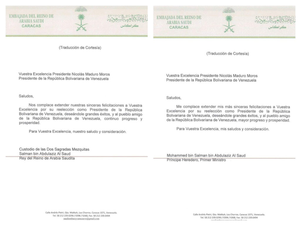 En el texto, ambas autoridades sauditas extendieron sus “sinceras felicitaciones” al jefe de Estado bolivariano por su reelección como Presidente y el deseo de grandes éxitos.