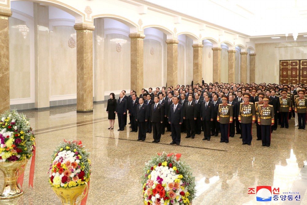 Por otra parte, varios miembros del Buró Político del Partido visitaron el Palacio del Sol Kumsusan, donde se conservan los cuerpos del presidente Kim Il Sung y del Dirigente Kim Jong Il y ante cuyas estatuas colocaron ofrendas florales, una de ellas a nombre de Kim Jong Un.